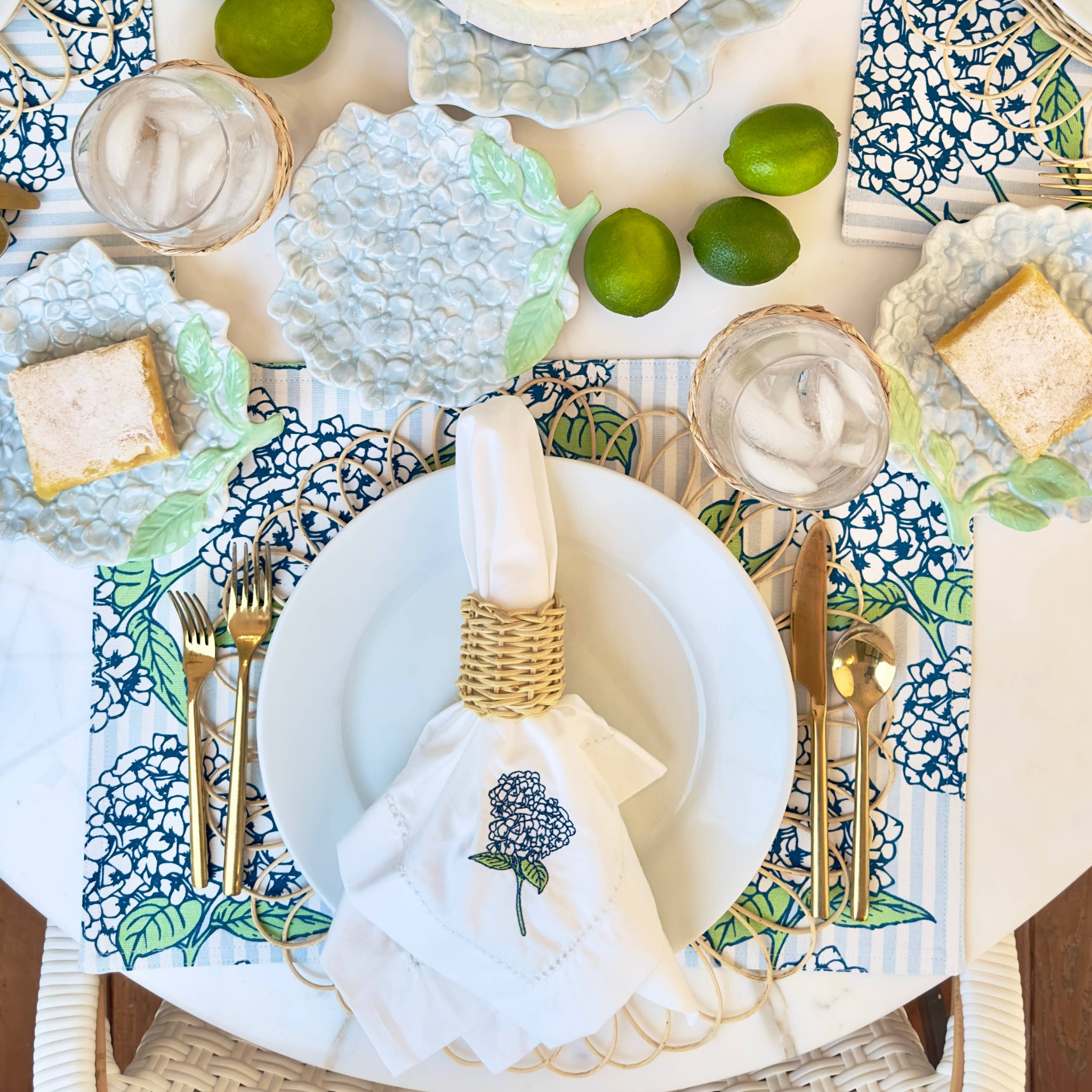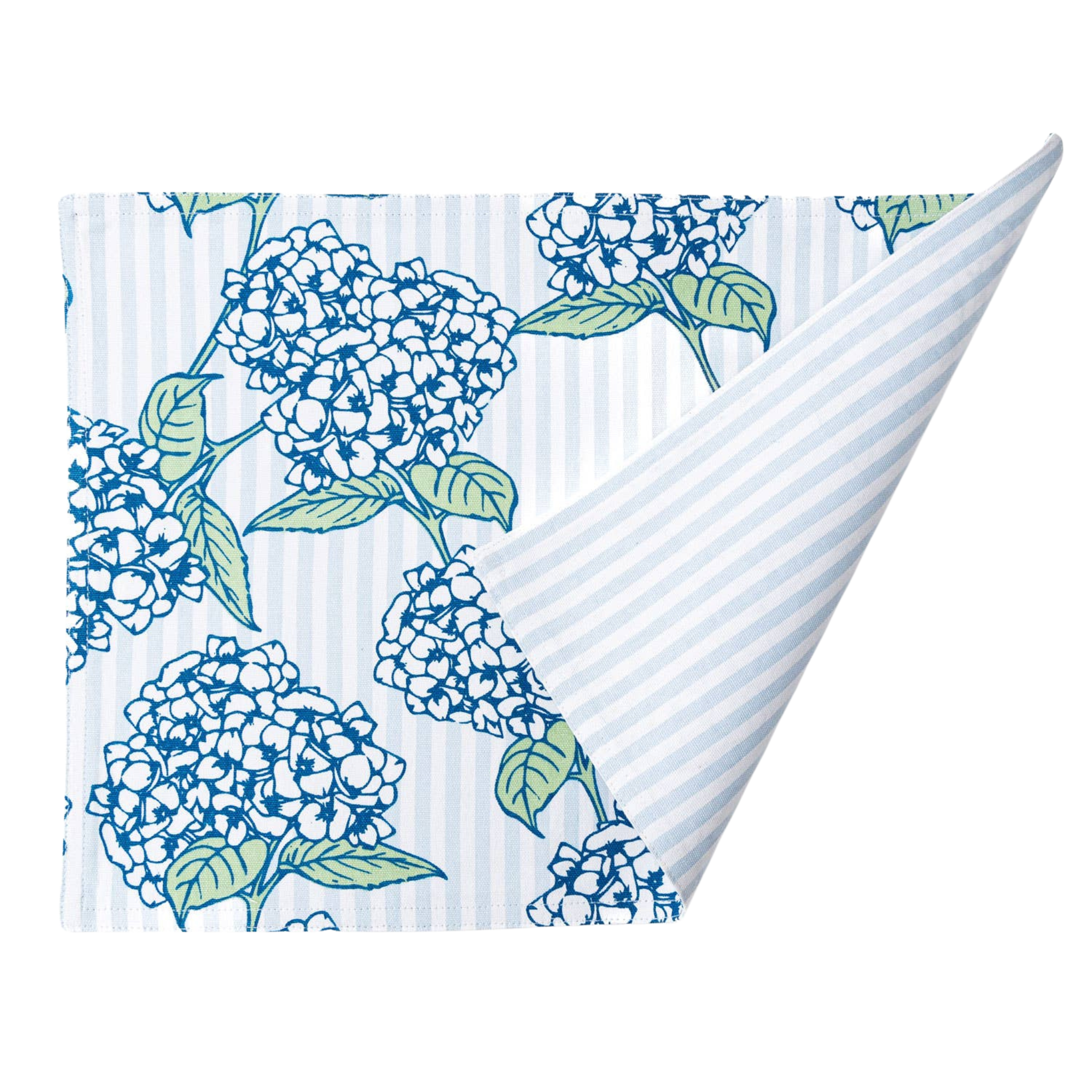 Add versatility, style, and a touch of floral charm to your table with these reversible cotton placemats. Each placemat features two distinct designs: one side showcases elegant blue stripes overlaid with delicate blue hydrangea stems, while the reverse features classic light blue stripes, allowing you to effortlessly switch between a floral, decorative look and a clean, timeless design. Crafted from 100% cotton, these placemats are soft yet durable, providing protection for your table while adding a polished, stylish accent to every meal. Their generous size accommodates plates, utensils, and glassware, making them perfect for casual dinners, family meals, or special entertaining occasions. The reversible design offers flexibility and creativity in styling your table, whether you want a cheerful, floral-inspired accent or a subtle, refined backdrop.
